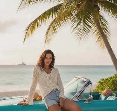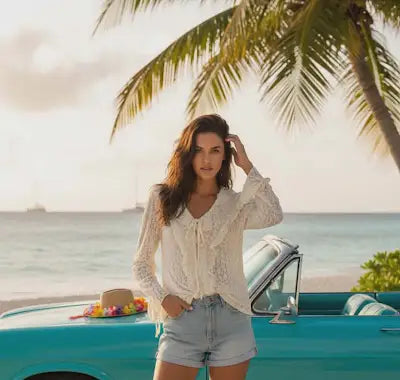 Jemná dámska blúzka z čipkovaného materiálu v krémovej farbe. Blúzka má elegantný véčkový výstrih doplnený o dekoratívne volány, ktoré jej dodávajú romantický a ženský vzhľad. Priehľadná čipka pôsobí ľahko a vzdušne, pričom blúzka má priliehavejší strih, ktorý pekne zvýrazňuje postavu. Dlhé rukávy sú mierne rozšírené a zakončené jemným lemovaním. Tento model je ideálny na jarné a letné dni, vhodný na bežné nosenie aj na spoločenské príležitosti v kombinácii s džínsami, sukňou alebo elegantnými nohavicami.