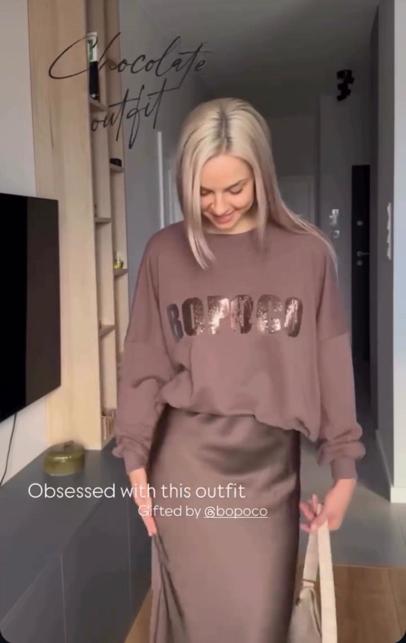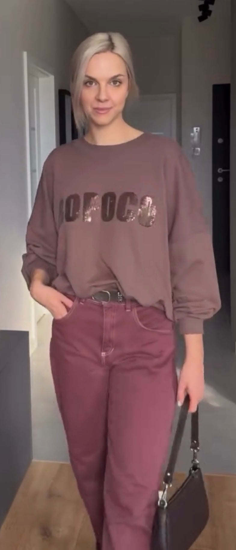 Mikina má moderný oversized strih, ktorý pôsobí uvoľnene a veľmi štýlovo. Je v jemnom čokoládovo-hnedom odtieni, ktorý je nadčasový a ľahko kombinovateľný. Vyrobená je z mäkkého, príjemného materiálu, ideálneho na celodenné nosenie.