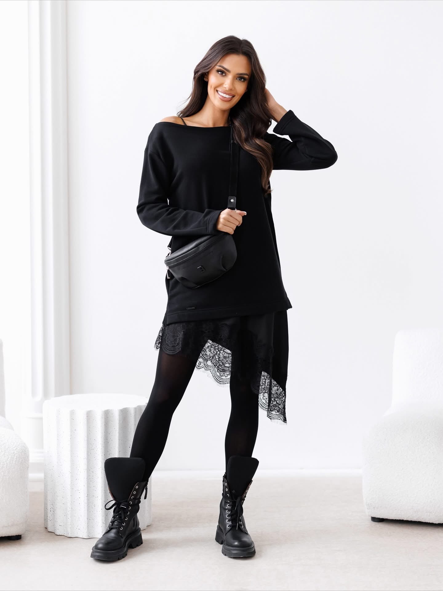 Elegantný a moderný dámsky set v nadčasovej čierno-hnedej kombinácii, ktorý spája pohodlie s ženskou rafinovanosťou. Set pozostáva z voľného topu s dlhým rukávom a sukne s čipkovým lemom, čím vytvára štýlový kontrast medzi ležérnosťou a eleganciou.