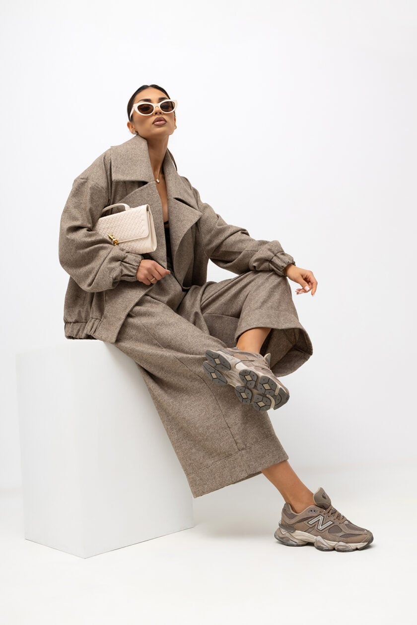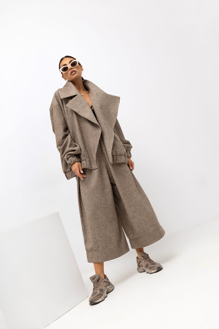 Toto nadrozmerné sako má moderný strih vyrobený z mäkkej, textúrovanej látky. Široké klopy, spadnuté ramená a voľný strih mu dodávajú módny a ležérny vzhľad. Neutrálny béžový odtieň ho robí všestranným a ľahko sa upravuje – je ideálne pre elegantné aj ležérne outfity.