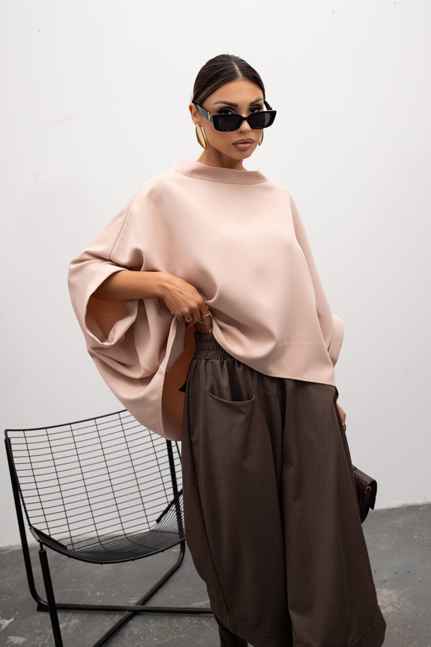 Táto nadrozmerná blúzka v štýle kimona od poľského výrobcu je perfektnou voľbou pre tých, ktorí hľadajú pohodlie a štýl. Široký, rebrovaný výstrih a rukávy jej dodávajú jedinečný charakter. Vďaka jednoduchému dizajnu sa hodí k rôznym outfitom – ležérnym aj elegantnejším. Hodí sa k džínsom, sukni a dokonca aj k šortkám, čím ponúka množstvo možností na vytvorenie módnych a pohodlných outfitov.