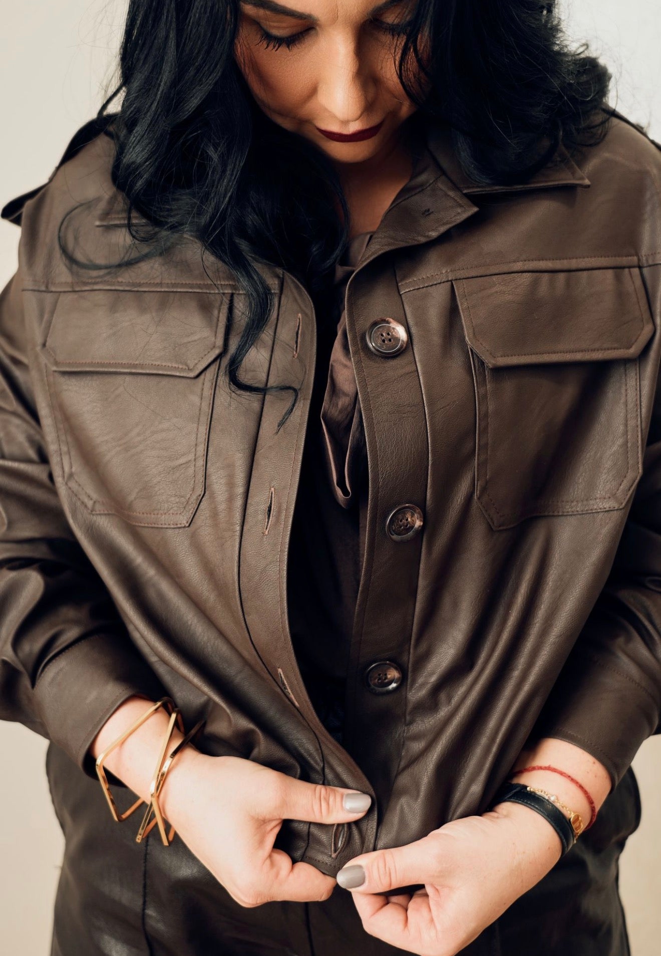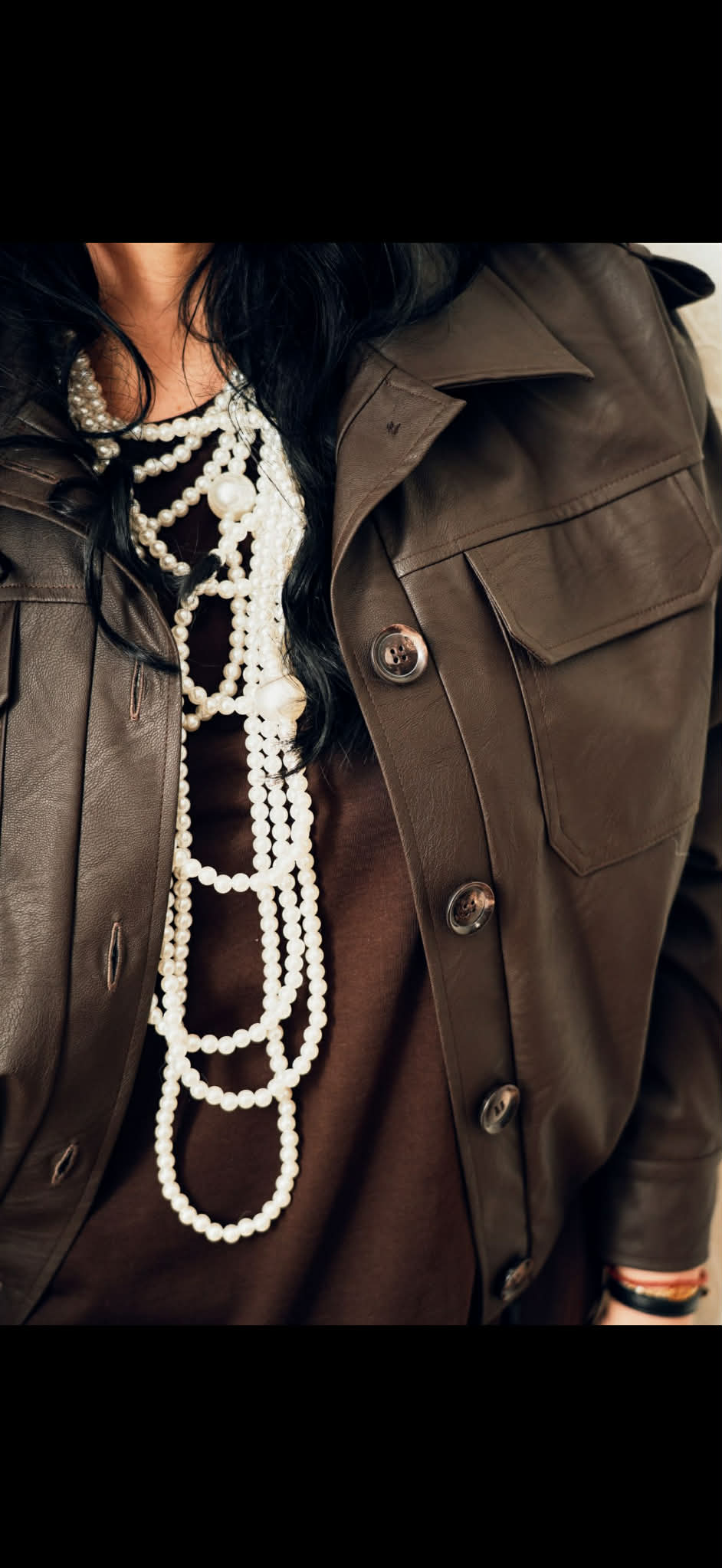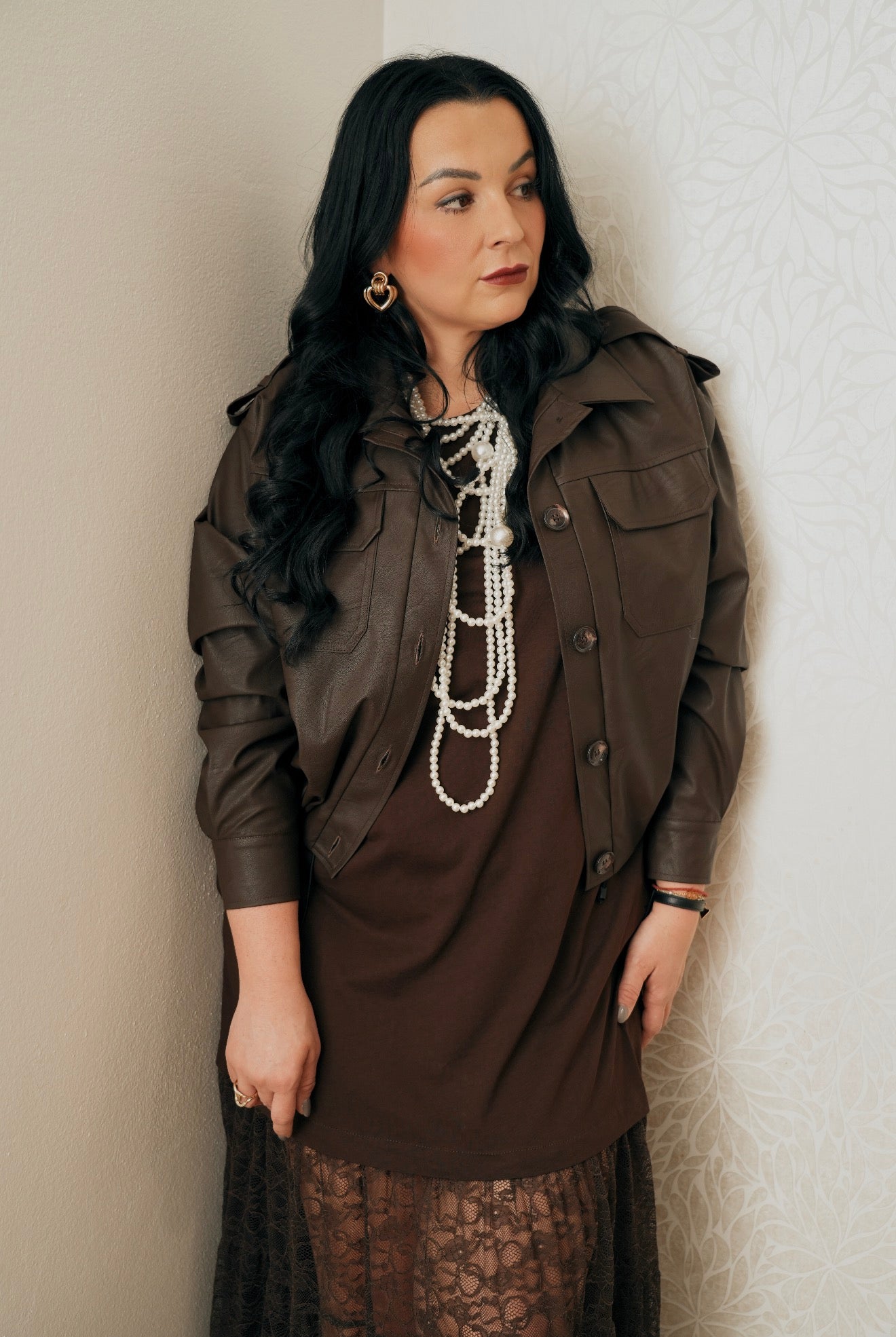 Kabát je v teplej hnedej farbe s prirodzeným, jemne matným leskom, ktorý podčiarkuje vzhľad kvalitnej kože alebo eko-kože. Pôsobí veľmi prírodne, luxusne a nadčasovo.