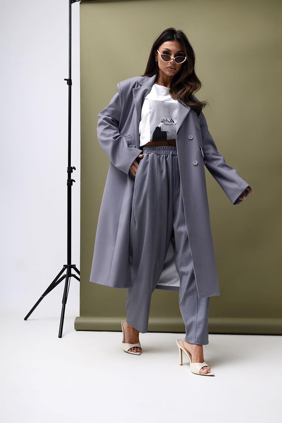 Štýlové predĺžené sako v elegantnom sivom odtieni, ktoré zaujme moderným oversized strihom a čistými líniami. Má voľnejší, rovný strih, vďaka ktorému pôsobí ležérne, no zároveň veľmi sofistikovane. Klasické klopy a jednoradové zapínanie podčiarkujú jeho nadčasový charakter.