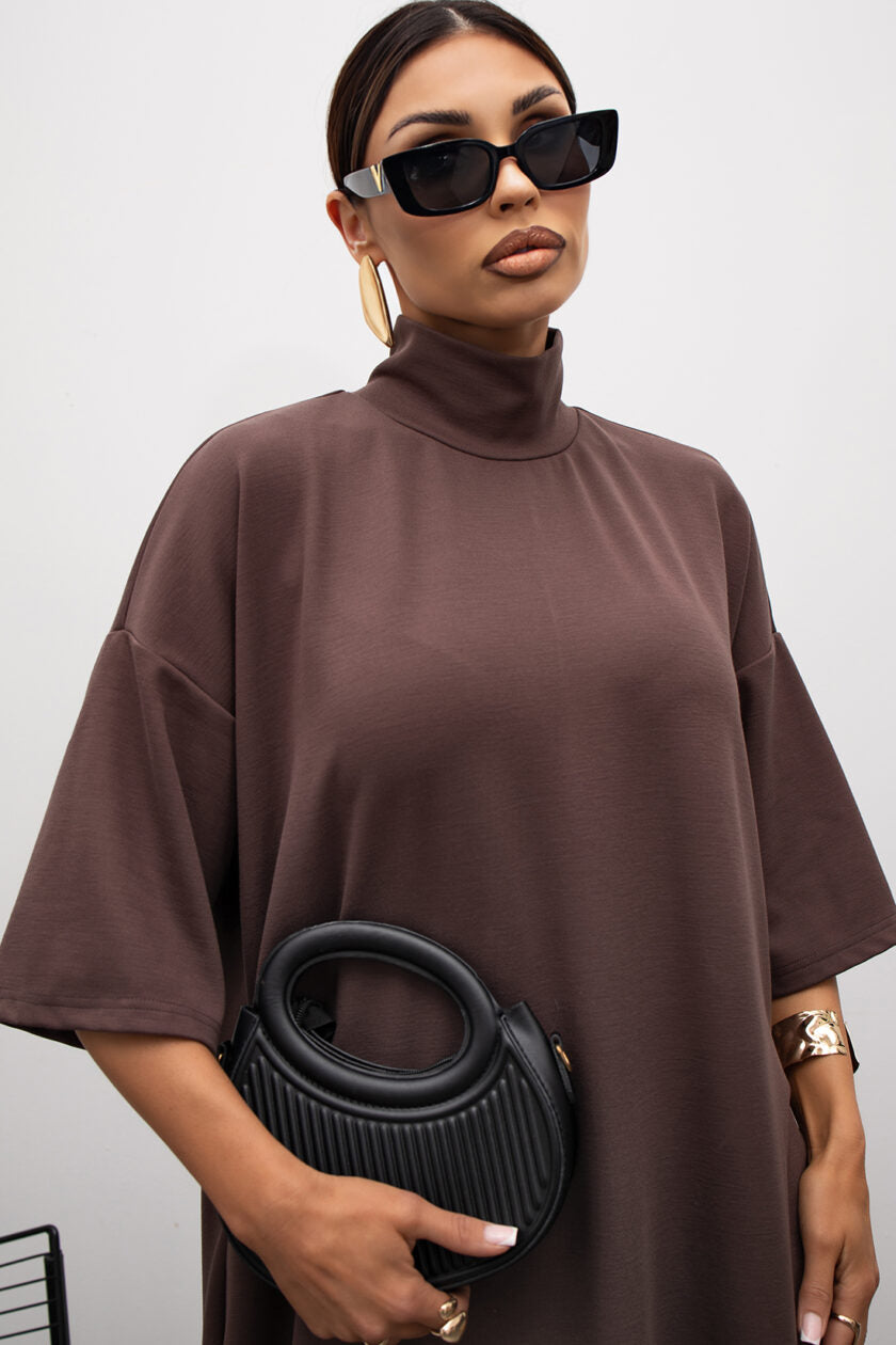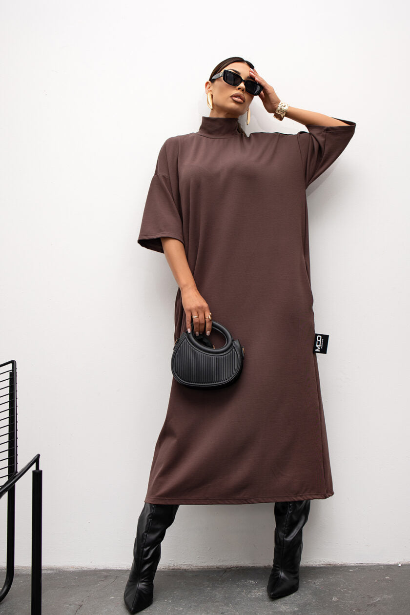 Tieto šaty po členky, vyrobené z mäkkého, elastického úpletu, kombinujú pohodlie a eleganciu. Rolákový strih im dodáva teplý a útulný pocit, ideálny na chladnejšie dni. Praktické vrecká vpredu dodávajú uvoľnený a ležérny vzhľad. Predĺžené rukávy jemne predlžujú siluetu a vytvárajú moderný, mierne nadrozmerný efekt. Celkový vzhľad je minimalistický, no zároveň štýlový – ideálny na každodenné nosenie aj na decentnejšie, elegantnejšie outfity.