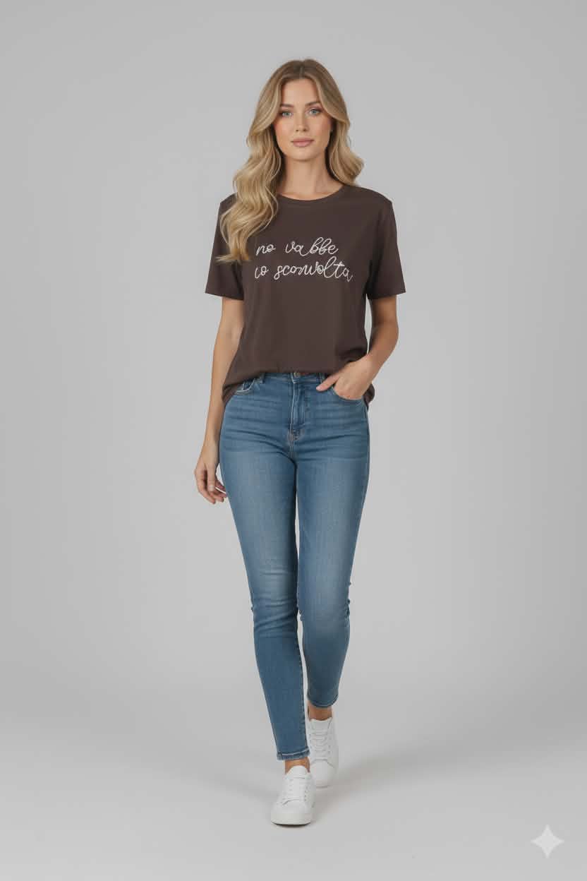 Štýlové dámske tričko v hnedom (čokoládovom) odtieni s elegantným nápisom v svetlej farbe na prednej strane. Minimalistický dizajn s decentným textom pôsobí moderne a nadčasovo, vďaka čomu sa tričko ľahko kombinuje s rôznymi outfitmi.